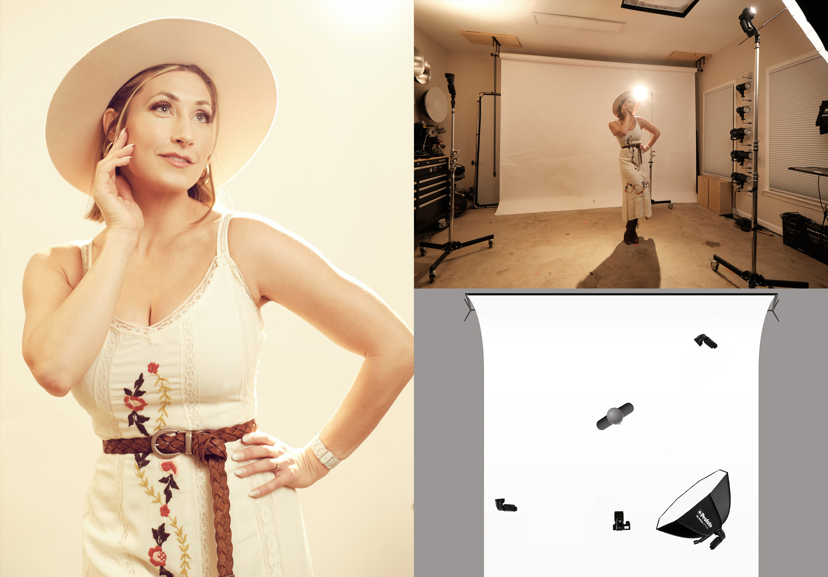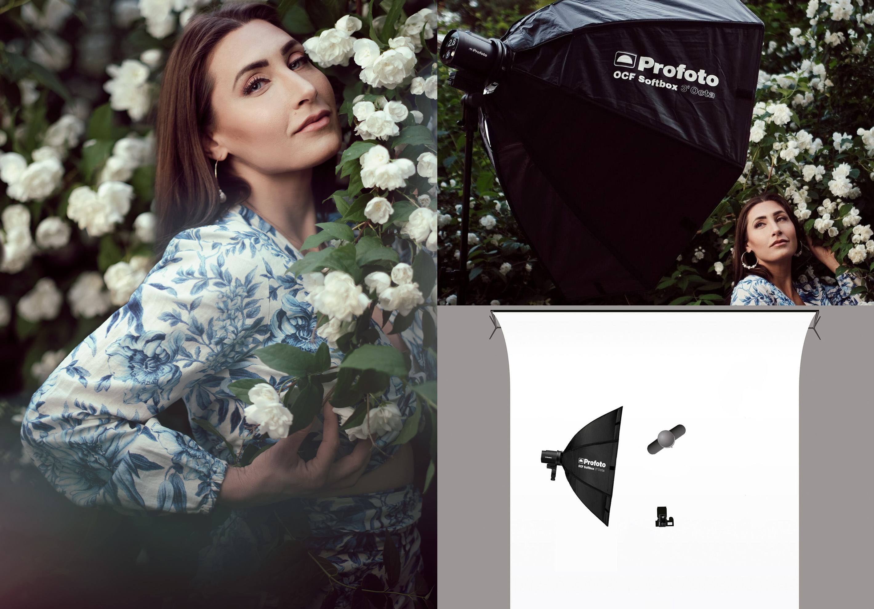 Use 1 x A2 together with an OCF II Adapter and an OCF Softbox 3' Octa. Use the live view in your camera to help set your ambient to the desired look. Place the flash and softbox on the same side as the natural light is coming from. Put your remote in TTL mode and snap a shot, then flip the remote into manual mode and fine-tune the output.